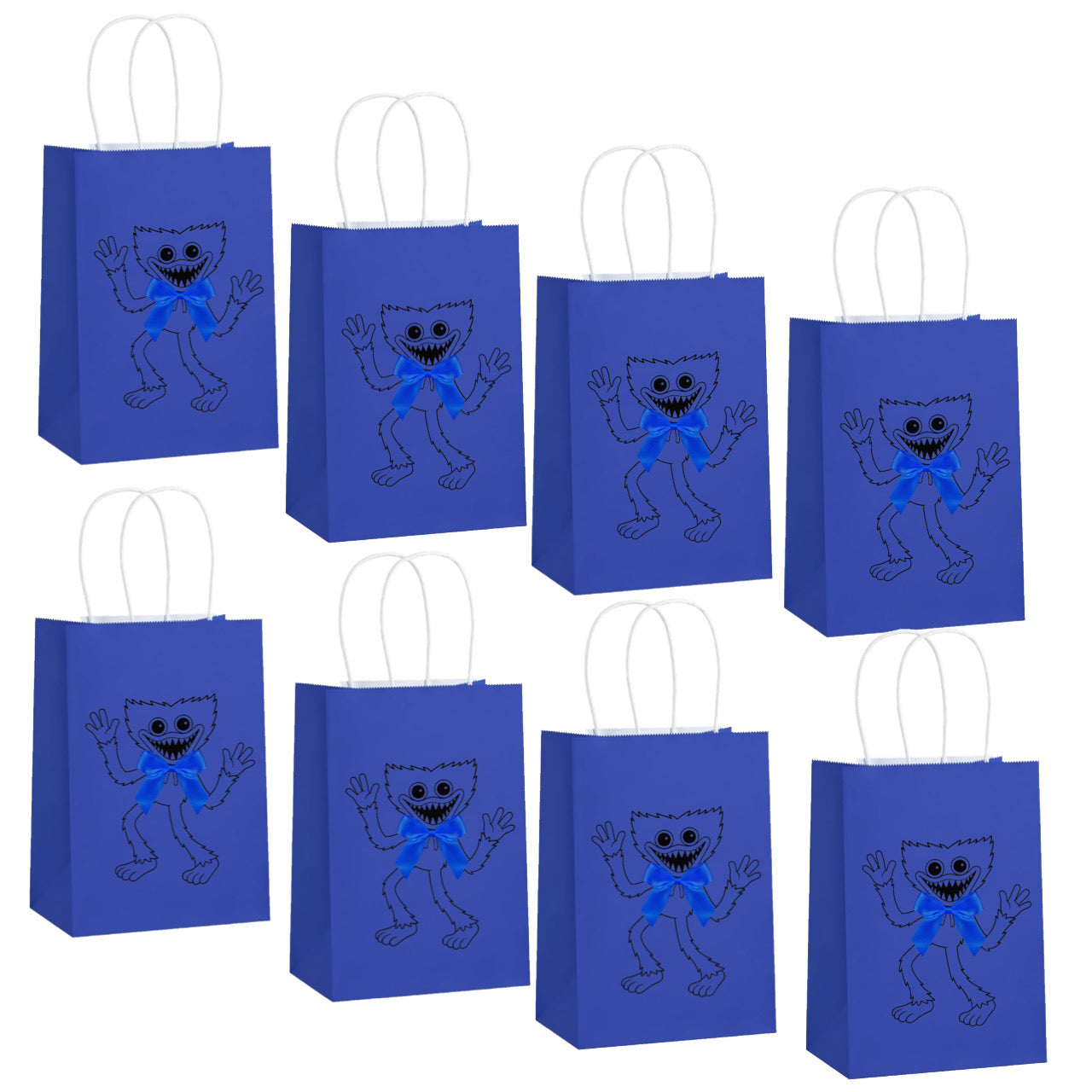 8 Empty Huggy Wuggy Paper Favor Bags for candy and favors. Each bag features Huggy Wuggy wearing a satin bow.