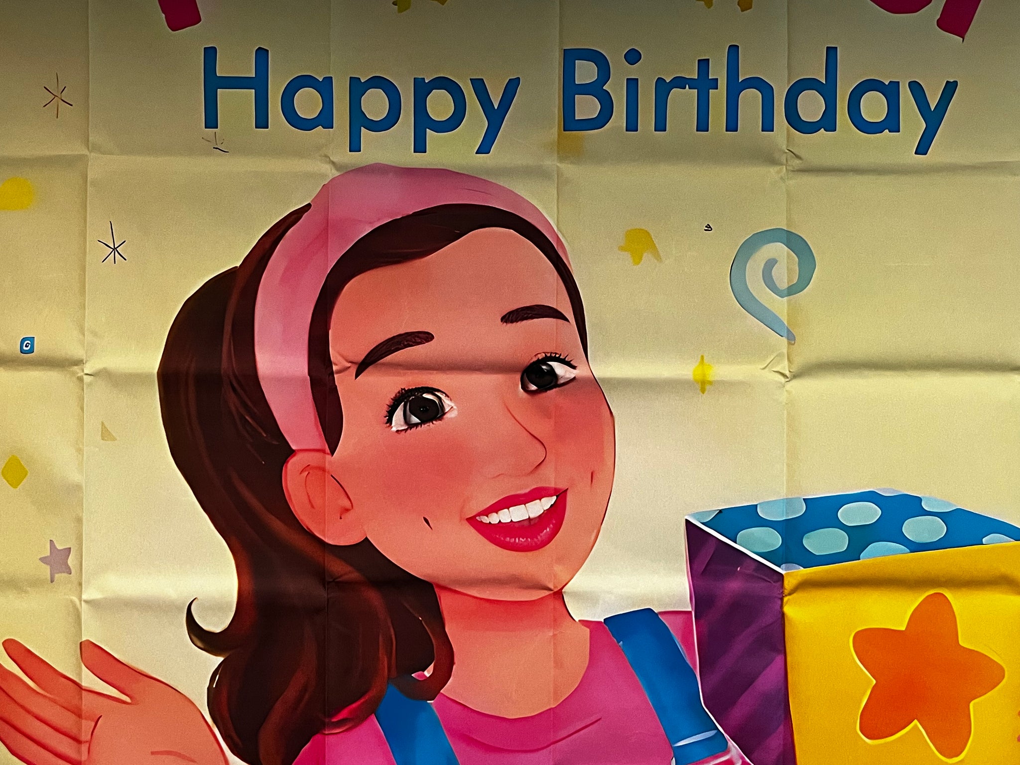 This backdrop features Ms. Rachel waving and celebrating your little ones birthday.  The print has a smear in the eye area. From 4-5ft distance its not noticeable unless "focused" on her eyes.  For those arts and crafters this may be an easy fix!